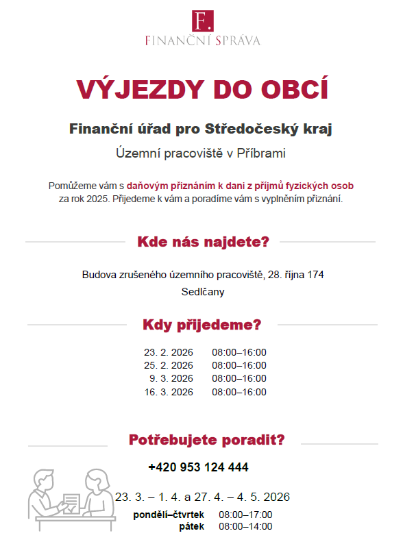 Termíny, kdy bude otevřený finanční úřad v Sedlčanech pro podání daňového přiznání k dani z příjmu fyzických osob.